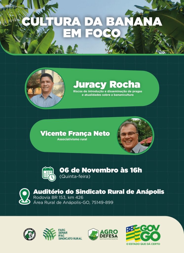 Durante o evento, o coordenador do Programa Estadual da Banana da Agrodefesa, Juracy Rocha Braga Filho, ministrará a palestra “Riscos da introdução e disseminação de pragas e atualidades sobre a bananicultura”. “Nosso papel é reforçar junto aos produtores a importância da prevenção, do monitoramento constante e da adoção de medidas de biosseguridade, especialmente diante do risco representado pelo Fusarium raça 4, que já afetou diversas regiões produtoras do mundo”, adianta ele. A programação também contará com a palestra “Associativismo rural”, do instrutor do Senar Goiás Vicente França Neto.