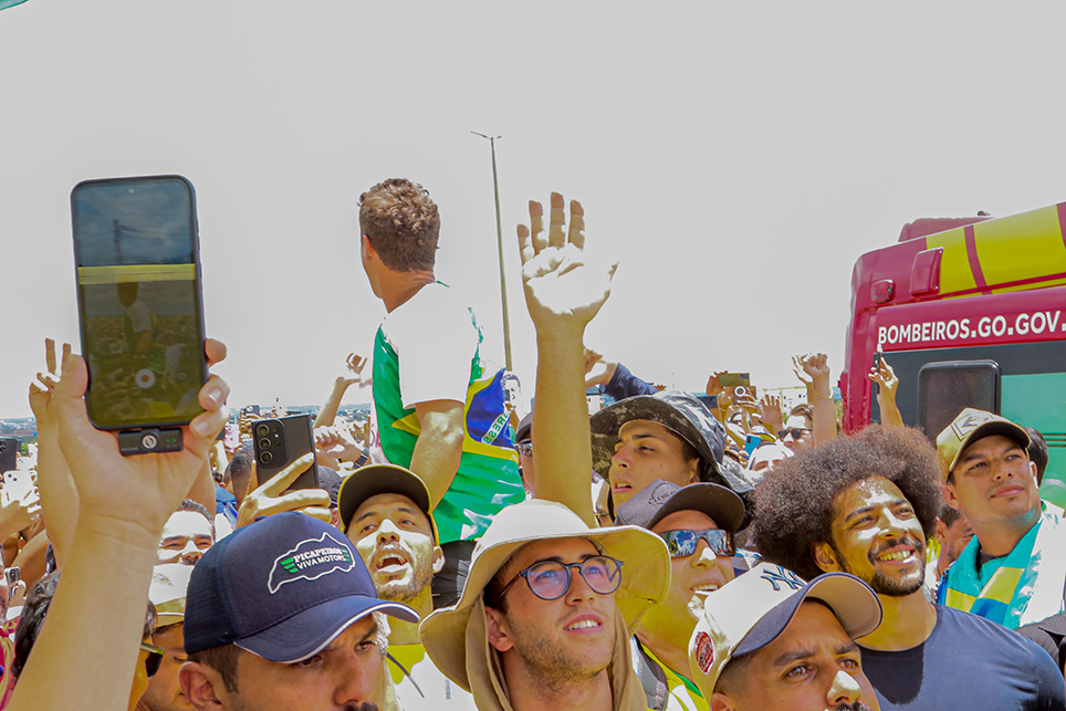 Além das pessoas na pista, milhares de outros moradores da região se espremeram nos viadutos e passarelas para ver Nikolas e seu apoiadores pela BR 040, maioria com roupas amarelas e verde e com faixas de frases de efeito, pedindo a saída de Alexandre de Moraes do STF e a soltura de Bolsonaro.