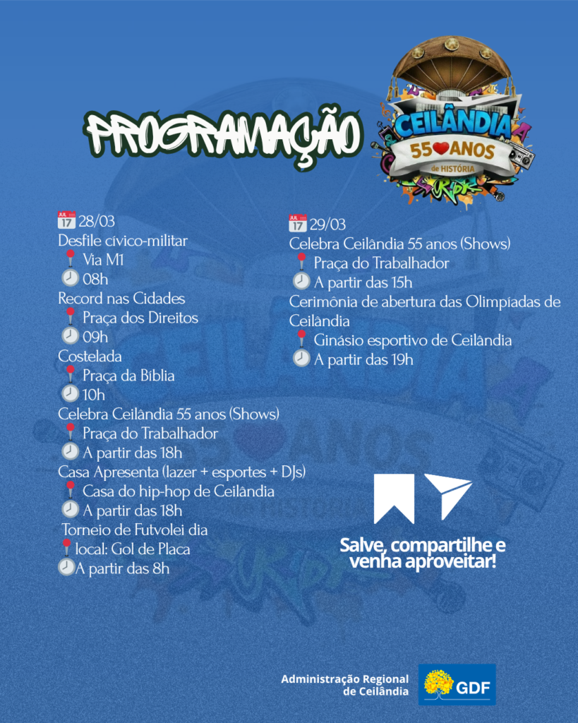 O administrador regional Dilson Resende ressaltou o significado da data: “Ceilândia chega aos 55 anos como símbolo de luta, trabalho e identidade cultural. É uma cidade construída pelo seu povo, com muita história e orgulho. Essa programação foi pensada para valorizar cada morador e celebrar tudo o que somos”, destacou o administrador.
