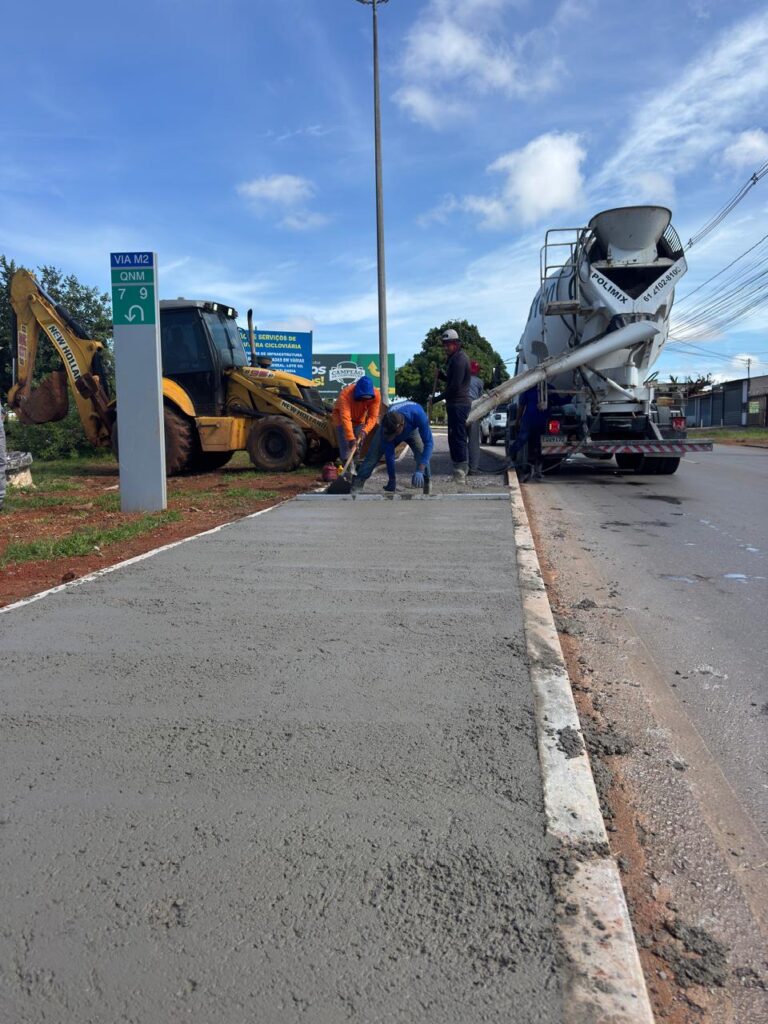 Obras seguem em diferentes frentes na cidade, com construção de 2,5 km de ciclovia e calçadas entre a Via M1 (Avenida Elmo Serejo) e a Avenida Hélio Prates, além de 1.300 metros de recuperação de calçadas na lateral da QNO 16, próximo à Praça da Bíblia._