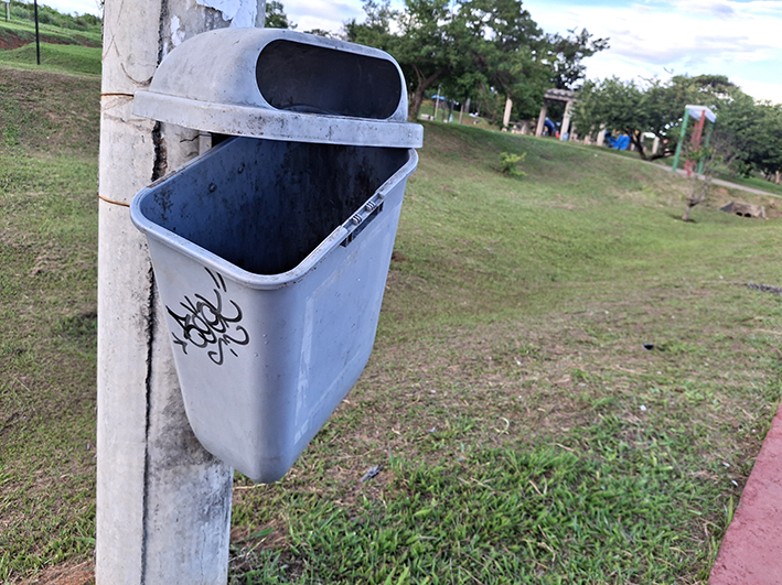 As poucas lixeiras que existem no local, maioria está quebrada ou depredada