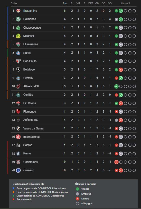 Veja como ficou a tabela do Campeonato Brasileiro após duas rodadas, com destaque para os ‘pequenos’ Bragantino e Chapecoense na parte de cima da classificação, e os ‘grandes’, Cruzeiro e Corinthians na zona de rebaixamento, vejam…