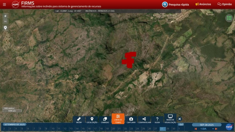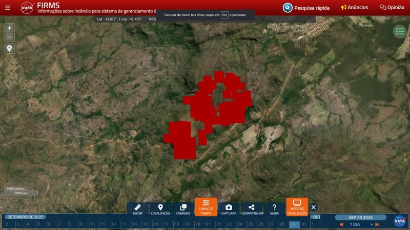 Imagens de satélite mostram locais dos focos de incêndio em Cavalcante (GO) nesta quarta-feira (1/10). Crédito: FIRMS | NASA