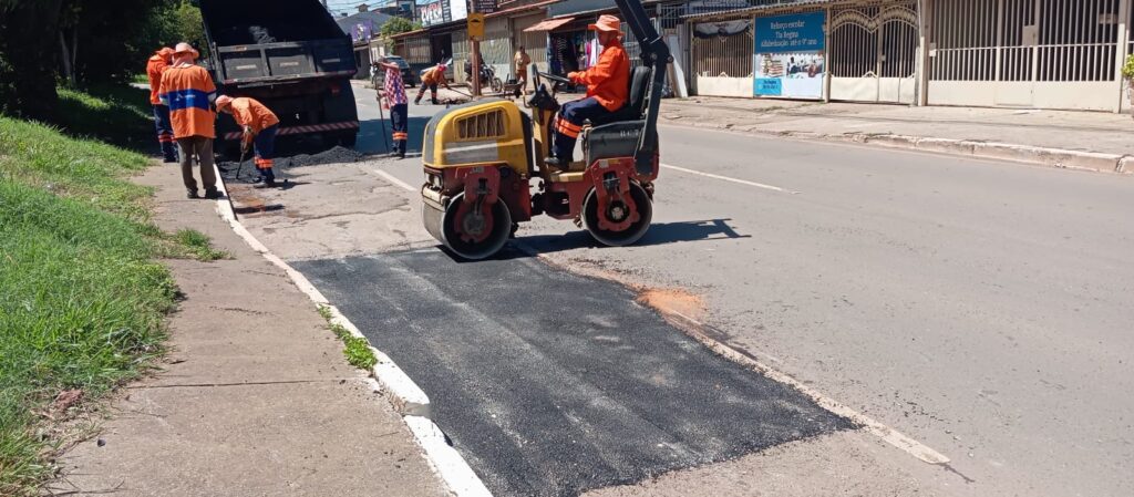 Para assegurar mais qualidade e resistência ao reparo, as equipes também utilizam caminhão rolo compressor, responsável pela compactação adequada da massa, além de realizar o recorte técnico do asfalto danificado antes da aplicação do novo material. O procedimento garante melhor acabamento, maior aderência e mais durabilidade ao pavimento.