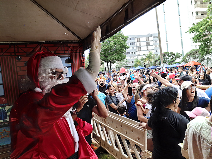 “Venham confraternizar com a gente, tem brindes para as crianças e muita diversão”, disse Luciano Monteiro, que faz o papel de Papai Noel.