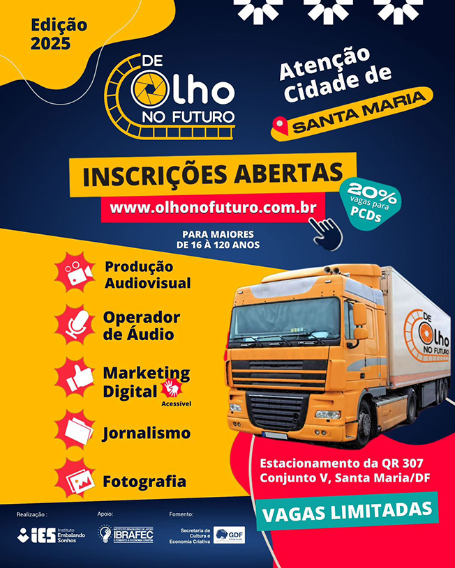 A cidade de Santa Maria (DF) recebe, em novembro, a carreta De Olho no Futuro, uma iniciativa gratuita que promove conhecimento, criatividade e inclusão por meio de oficinas voltadas à indústria criativa. As atividades oferecem aprendizado prático e estimulam o desenvolvimento de novas habilidades em áreas como Produção Audiovisual, Jornalismo, Operação de Áudio, Fotografia e Marketing Digital, este último com acessibilidade em Libras.