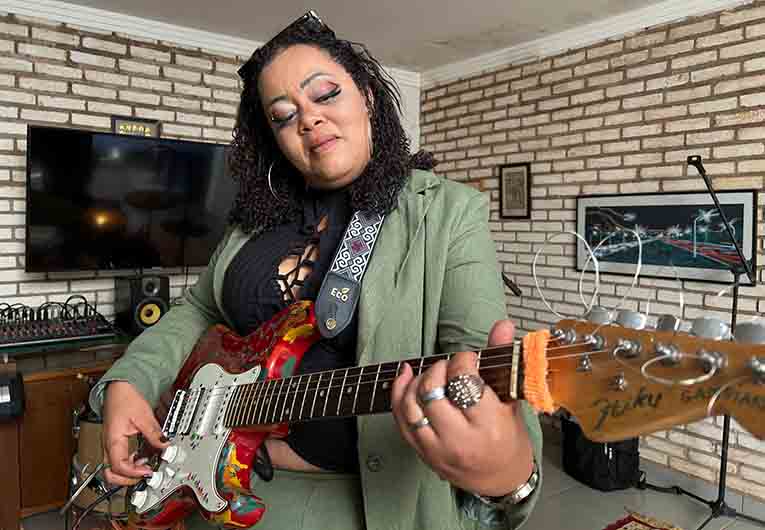 “O rock sempre foi visto como um território branco, e o rap, muitas vezes, é colocado em uma caixa. Eu quebro essas barreiras. Minha negritude é sobre mostrar que nosso lugar é onde quisermos estar, inclusive fazendo rap misturado com rock”, afirma Dona Gi, que é mulher preta, periférica e mãe solo. “Levar essa mensagem em primeira pessoa para os jovens é a razão de ser desse projeto.”