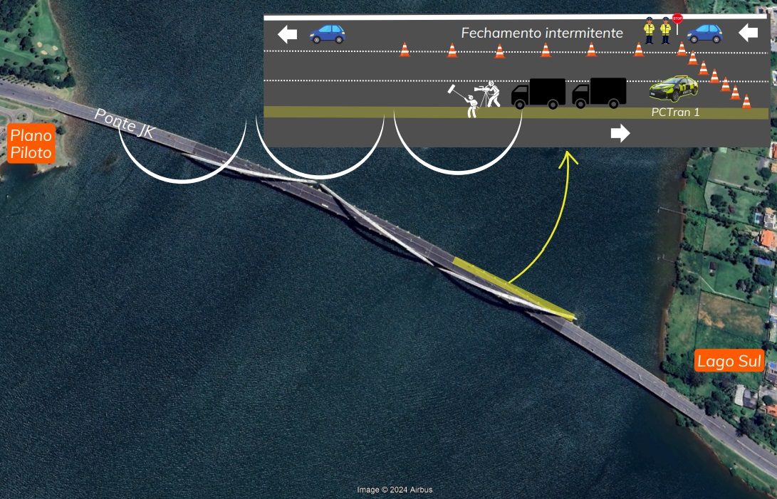 Nesta quinta-feira (27), em razão das gravações de um filme, o Departamento de Trânsito do Distrito Federal (Detran-DF) fará interdições na Ponte JK. Entre a 1h e as 3h30, será realizado o fechamento intermitente da via, no sentido Plano Piloto, da cabeceira da Ponte JK até o final do primeiro arco.