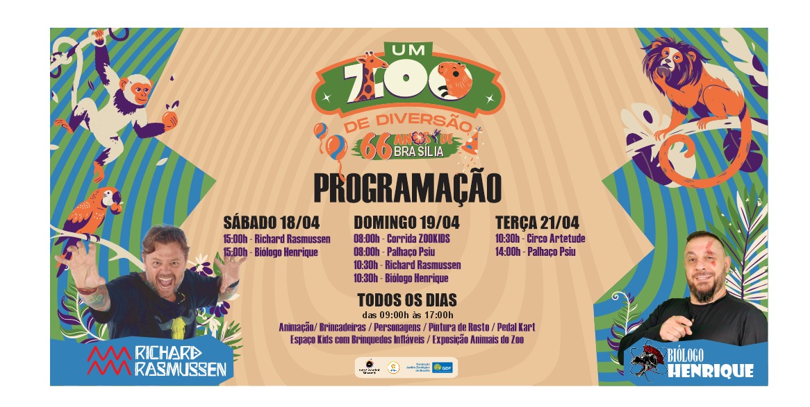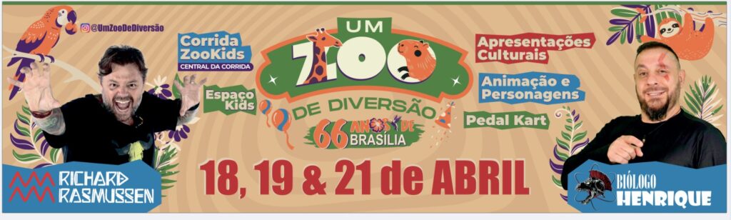 • O Zoológico de Brasília recebe mais uma edição de “Um Zoo de Diversão”, que acontece nos dias 18, 19 e 21 de abril, das 9h às 17h, dentro da programação especial de comemoração dos 66 anos da capital federal