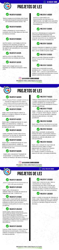 - Vereador, que atualmente é o vice-presidente da Casa de Leis em Valparaíso de Goiás apresentou no ano de 2025, 27 Projetos de Lei, sendo 19 deles na área de inclusão social, sua ‘bandeira’
