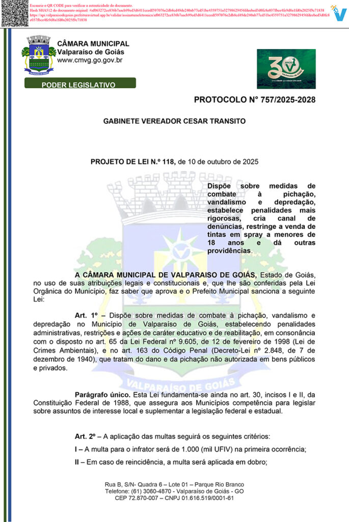 O vereador também se mostra preocupado com as pichações e vandalismo. Assim propões regras mais duras para punir quem insiste em cometer esse tipo de crime na ciadede.